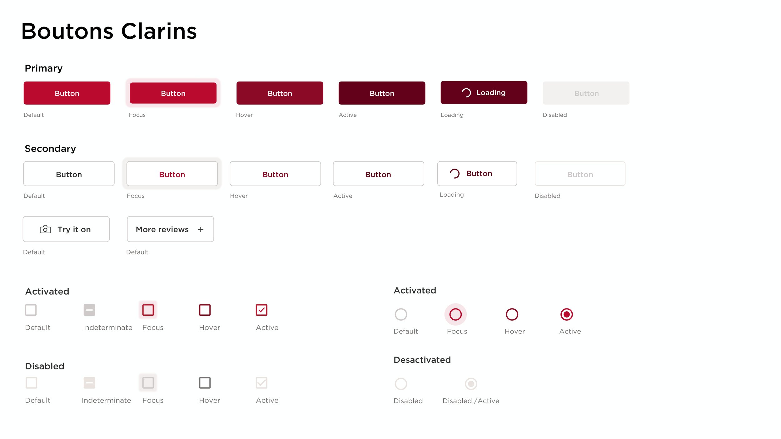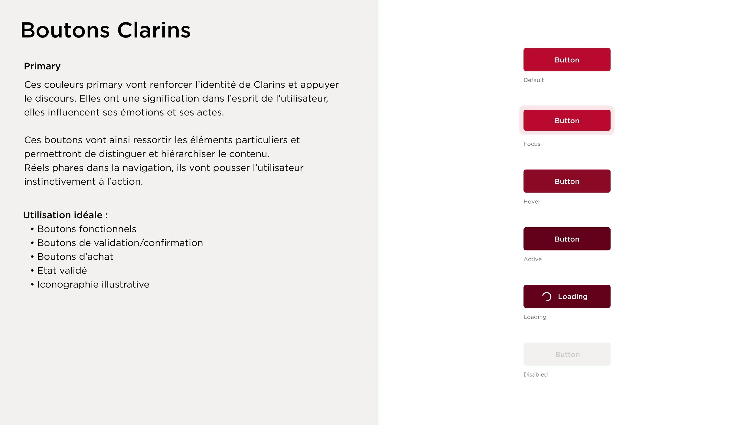 Le bouton “Primary” utilise le rouge Clarins pour incarner l’action. Il devient un repère fort dans la navigation.